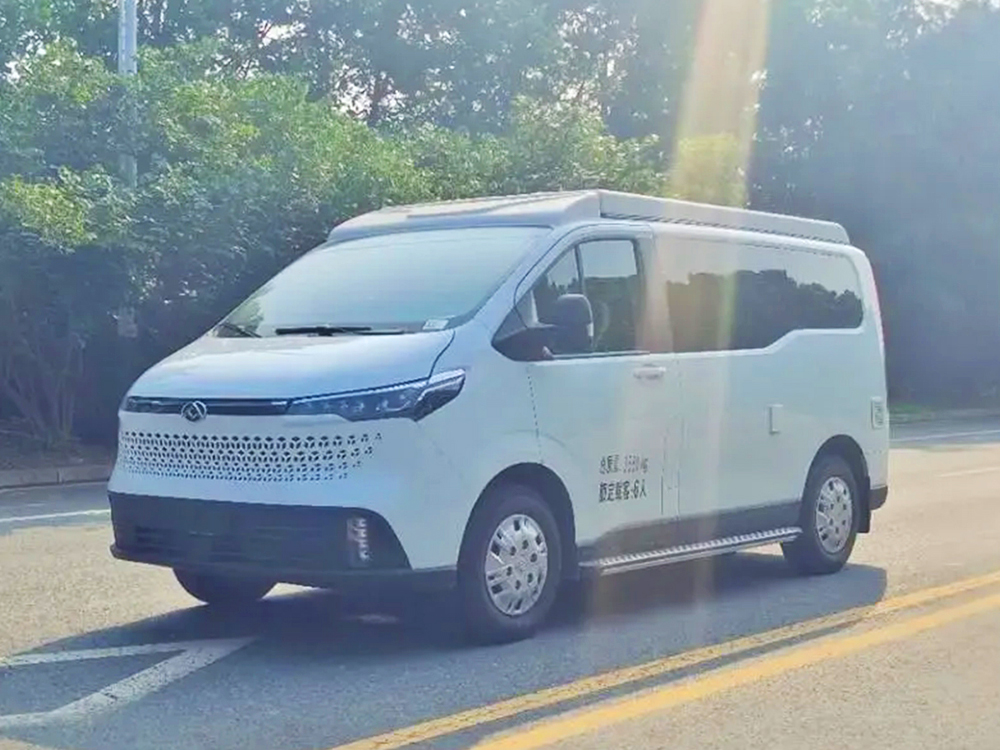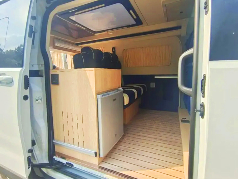 车内布局采用3+2的座椅布局方式,可以同时满足5个人的核载人数。会客厅区域可装配一张拆卸的桌板,为乘客提供办公、娱乐、就餐的需求。在中门区域则设计了厨房吧台,内嵌了一台电磁炉,可以在车内烧水或煮点面条的需求。同时,吧台区域还配置了一台冰箱,露营时可以将啤酒饮料放在这里冷藏。
