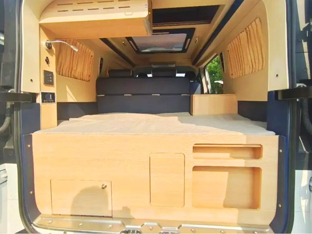 车辆尾部采用的是对开门的设计,打开后可以看到,采用的是横置床铺的布局,床铺尺寸可以达到1.15m×1.75m,也可以满足一个大人和一个小孩在这里休息。同时在车尾还配置了一台变频驻车空调,可以更好的恒定车内温度。床铺的右侧可以翻折起来,搭建一个临时的洗浴间,满足乘客的户外洗漱需求。在床铺下方还配置了一台外置抽拉灶台,想要在户外烹饪美食也是没有问题的。