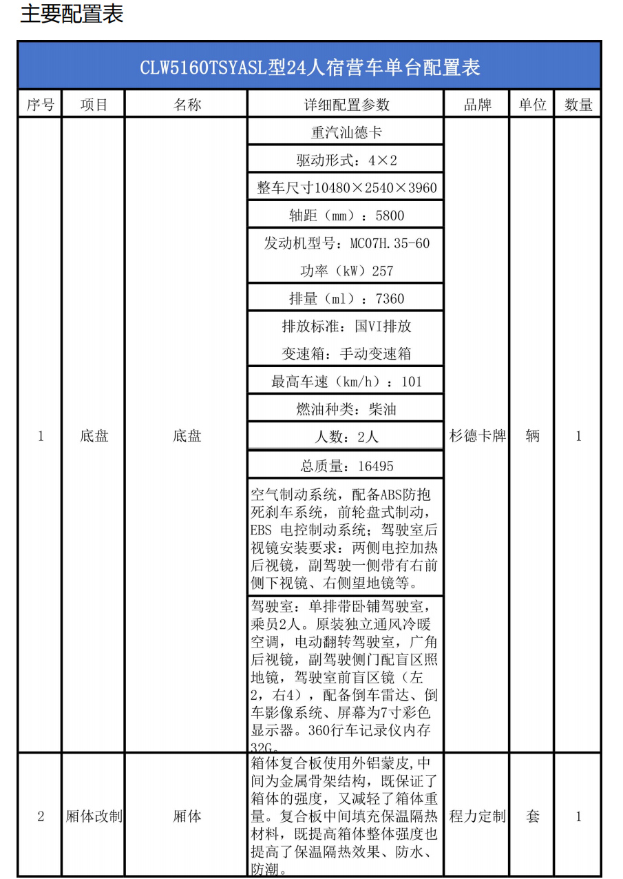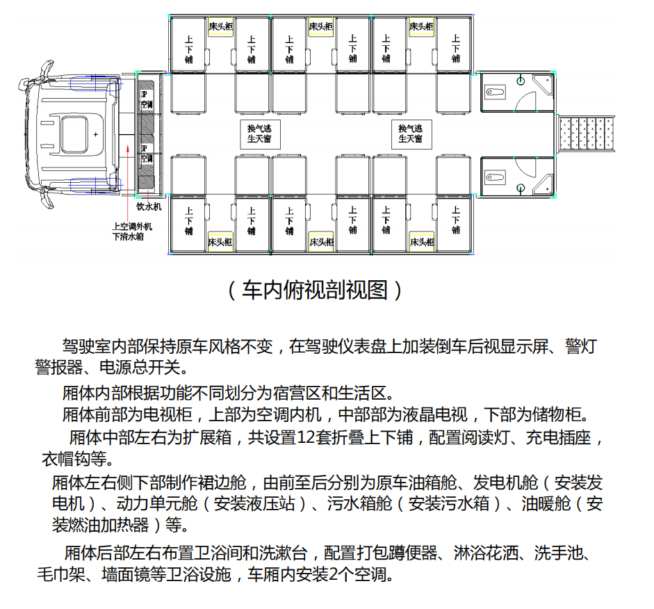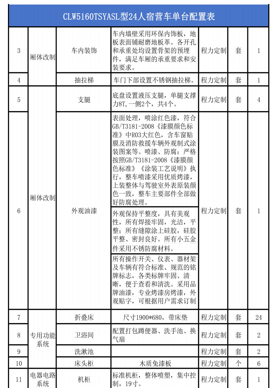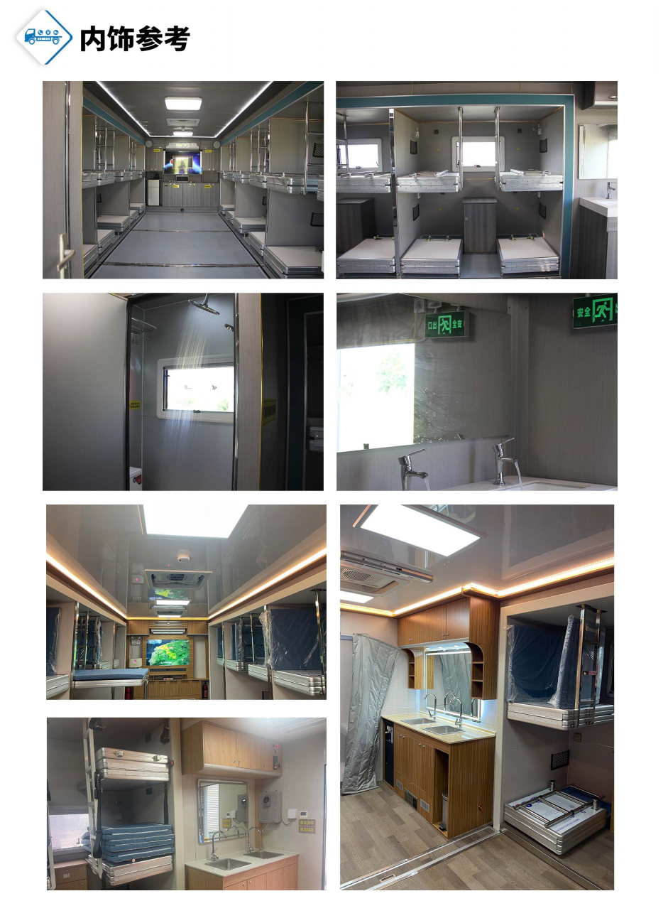 宿营保障车是后勤保障之一,其目的是使部队得到休息和整顿,为继续行军或战斗作好准备。适用公安、特警、公安、边防、卫生、交通、矿山、地质、军队等部门长期野外作业、勘察、救援、抢险、救灾等宿营用。宿营车外观像厢式货车,采用保温封闭式厢体,设置有门窗。车厢内放有可折叠床,每个床位还配有微型照明灯。此外还可根据需求配备床头柜、饮水机、电视机、抽屉、空调、电视、发电机等设备,功能非常齐全。适用公安、特警、公安、边防、卫生、交通、矿山、地质、军队等部门长期野外作业、勘察、救援、抢险、救灾等宿营用。