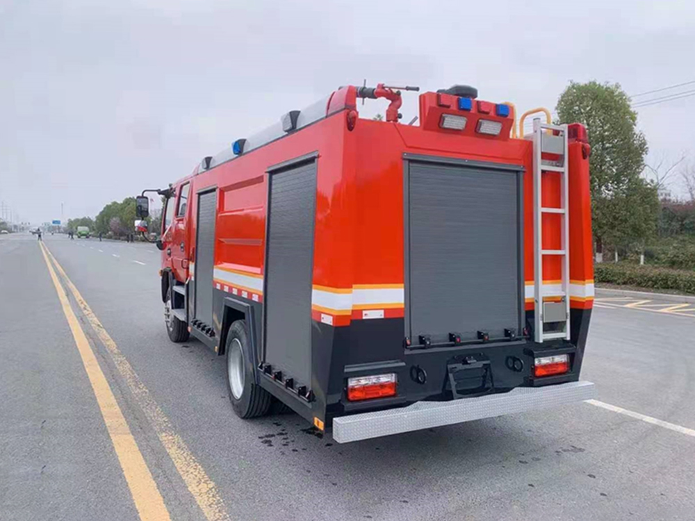 消防泵在箱体中间或者后置,泵房左右两侧4个出水口、器材箱左右后侧均有新款易拉高强度铝合金卷帘门。