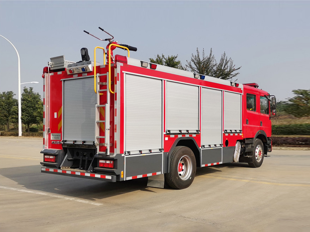消防泵在箱体中间或者后置,泵房左右两侧4个出水口、器材箱左右后侧均有新款易拉高强度铝合金卷帘门。