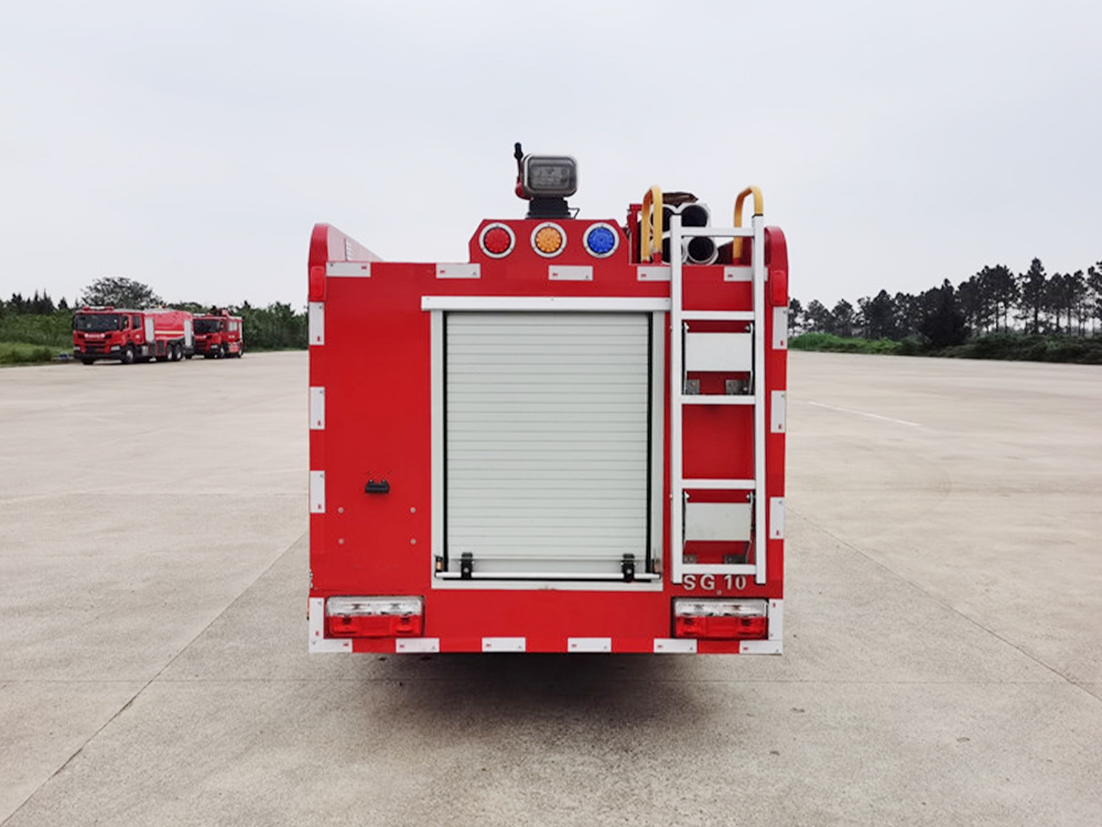 消防泵在箱体中间或者后置,泵房左右两侧4个出水口、器材箱左右后侧均有新款易拉高强度铝合金卷帘门。
