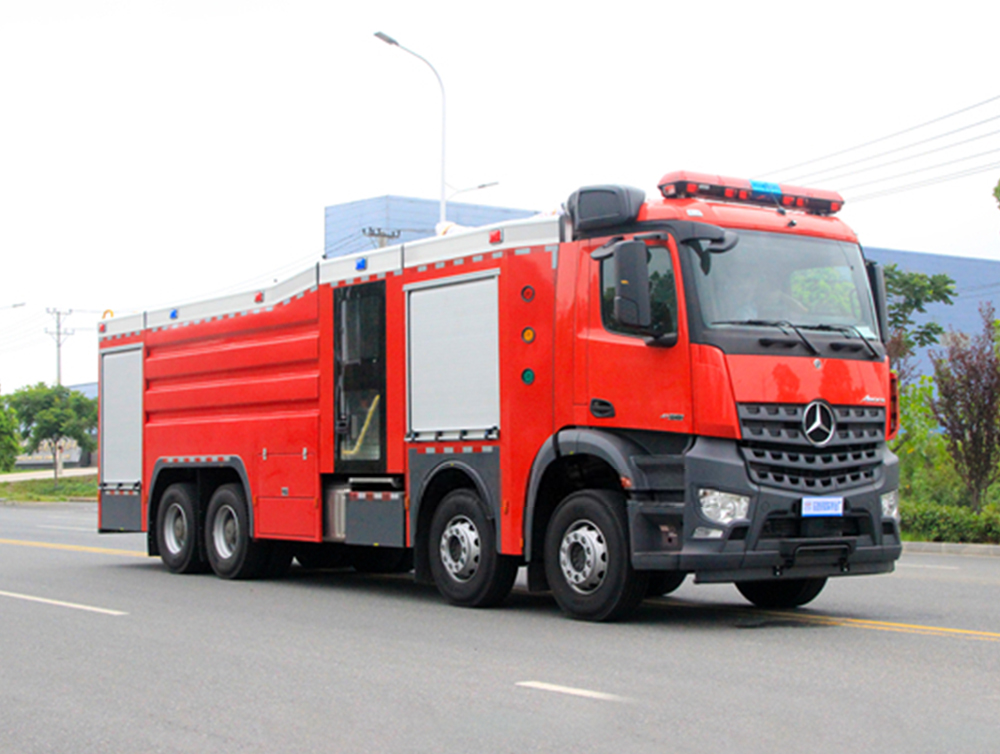 奔驰Arocs 原装单排双门驾驶室,全钢框架焊接结构,驾驶室四点悬挂,空气悬挂驾驶员座椅,带座椅位置调整;固定式副驾驶座椅,独立乘员室6人,座椅采用模具成型,安全舒适。罐体材料采用优质不锈钢,内设纵,横防荡板,经久耐用;器材厢门引进欧洲技术生产的铝合金型材内藏式搭接技术制造,全铆接结构,采用铝合金帘子门,滚筒、滑槽导向,启闭轻便、噪音小;器材厢两侧及后部翻板式踏板,采用气弹簧、门止限位装置双重固定,安全性能可靠;除原车设备外,驾驶室顶部前端为长排警灯,车身后配有24V/60W火场照明灯一只,车辆两侧上方各配有红蓝相配的爆闪灯,下方安装安全标志灯,乘员室、器材箱、泵房内均装有照明灯,驾驶室内加装有取力器控制指示灯、100W警报器、回转警灯开关、后部照明灯、通讯设备预备接口等; |