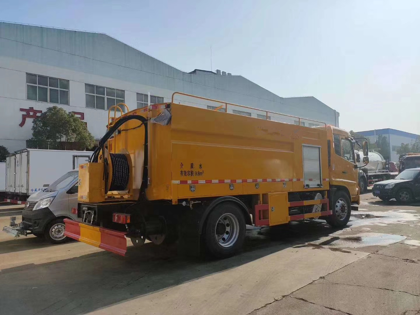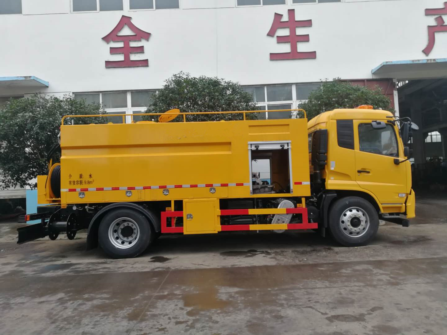整车说明: 1,罐体有效容积:9.8立方米,罐体外形尺寸(长×宽×高)(mm):4800(前端1500mm为高压水泵)×2440×1500;整车长度/前悬/轴距/后悬/的对应关系为(mm): 7280/1430/3800/2050,7430/1430/3950/2050,7680/1430/4200/2050, 7700/1430/3800/2470,7950/1400/4500/2050,7980/1430/4500/2050,8180/1430/4700/2050,8480/1430/5000/2050,8780/1430/5300/2050,9280/1430/5800/2050;2,侧防护及后下部防护装置均采用Q235A材质,均采用焊接连接,后下部防护尺寸:280×50(mm),离地面高度470mm.3,ABS型号/生产厂家:3631010-C2000/东科克诺尔商用车制动系统(十堰)有限公司,ABS 8/东科克诺尔商用车制动系统(十堰)有限公司, 4460046450/威伯科汽车控制系统(中国)有限公司.该产品是以清洗路面为主的移动环卫车辆,专用装置为高压水泵.随底盘选装驾驶室.选装选装正后部图片.